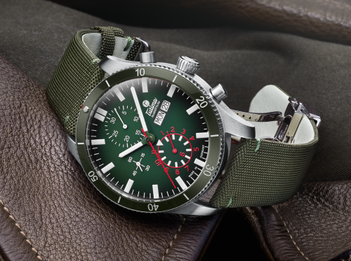 先“色”夺人,43mm墨绿渐变盘面,具备时分秒计时小盘,性能出众。搭载TUTIMA 310改良机芯,即使在恶劣环境下亦可保持精确,精钢表壳的细致做工,更令人折服,采用抛光与拉丝工艺结合,让整体视觉效果得到全新体验,打破了传统光滑的常态限制,诠释层次分明带来独特享受。