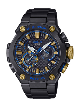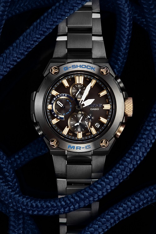 MR-G“勝色”系列整体设计采用“和”主题,兼顾强韧与华丽,表圈采用带有重金属结晶感的钛金属,并利用钛加热处理使之在表面形成独特的结晶花纹,用以表现日本刀刀身和刀刃交界处的银砂花纹。设计样纹来自于“毗沙门天王”甲胄中的“毗沙门龟甲”,增强美感的同时也体现出日本古代勇武之人的威严感。该系列表款均以太阳能为动力,配备高亮度LED照明以及六局电波,并带有指针位置自动修正功能,支持手机蓝牙连接,可显示27城市的世界时间。其表外观采用人造蓝宝石玻璃镜面,使整体带有简洁华丽的质感,兼顾舒适与耐久性。