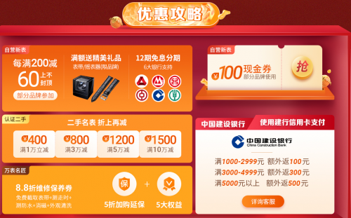 100元自营新表现金券,购买自营新表部分品牌正价手表可使用(一口价/秒杀/特卖/预售/表带等特殊商品除外)。满额赠送真皮表带、原装表带、定制摇表器等精美礼品,抢完即止,先到先得。