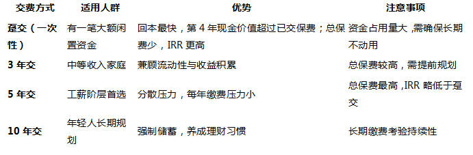 选择交费方式时,需结合家庭现金流、流动性需求和长期规划综合考量。持有年限越长,复利效应越显著,建议至少持有10年以上。