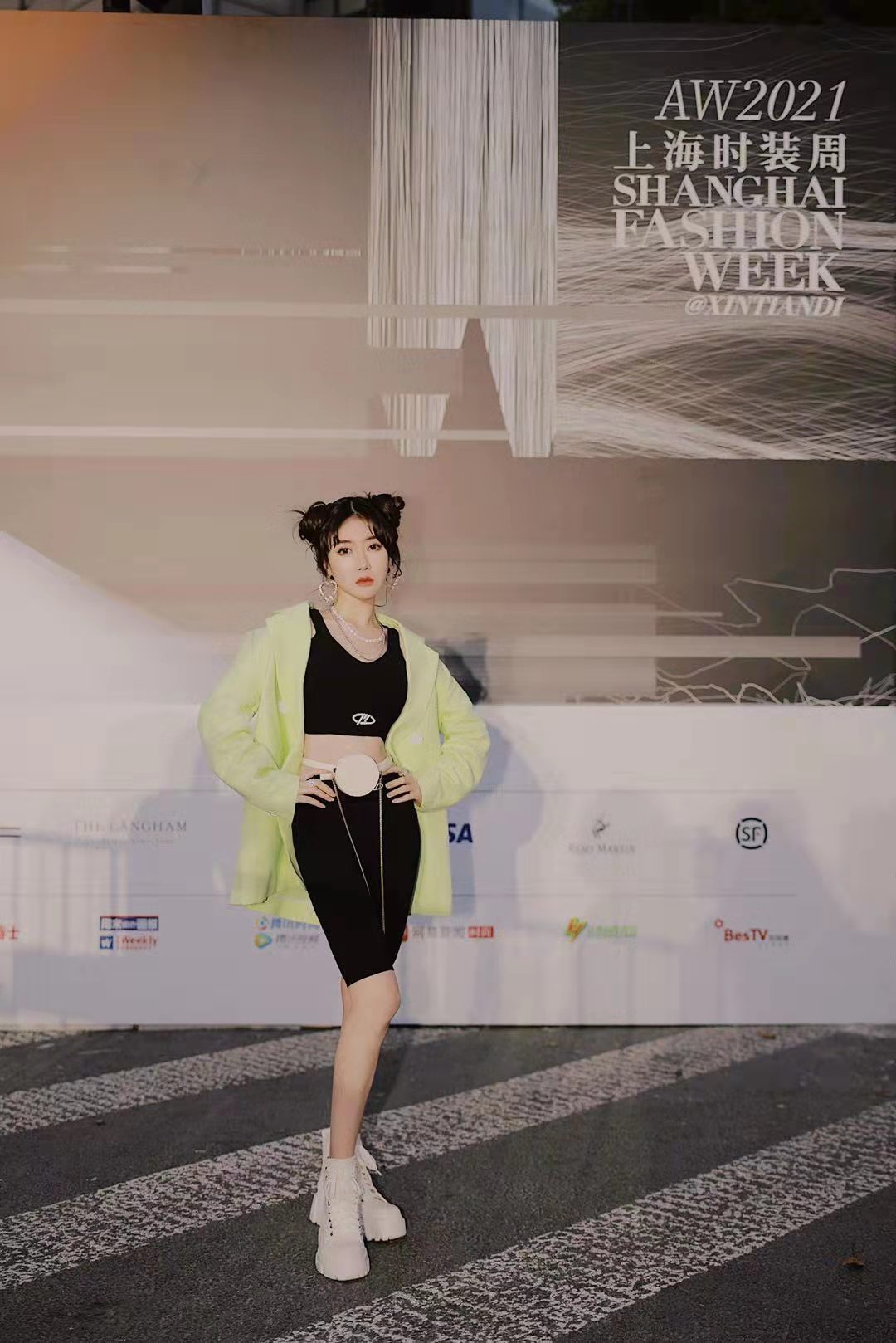 造型里搭配的妆容和耳环都是金属质感与造型相呼应,超级夸张的亮钻耳环,更凸显出温果希身上的飒气,可能这一整身造型对于普通人来说碰都不敢碰,但温果希的时髦感完全hold得住。