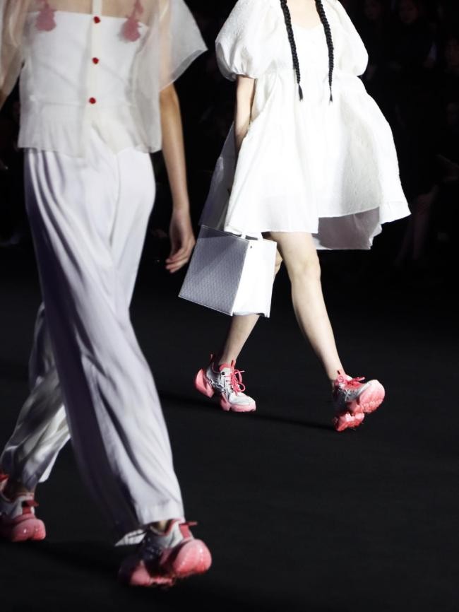 在此次大秀上,OGR万物皆「RONG」系列机甲鞋,将未来赛博世界的超前视觉做为设计灵感。当时间与空间的界尺消融时,霓虹绚烂伴随着万物扭曲、再组、重叠。在这看似无暇的隐藏下,自然环境的真实恶化与压抑都曝露在这多次元视角下,「RONG」系列机甲鞋将环境保护的构思初衷融入产品设计中,呼吁人类关注地球生态。
