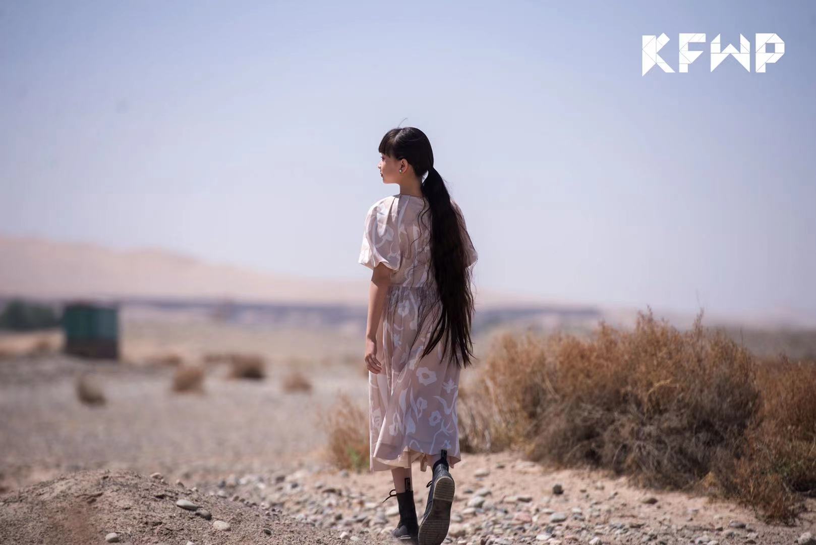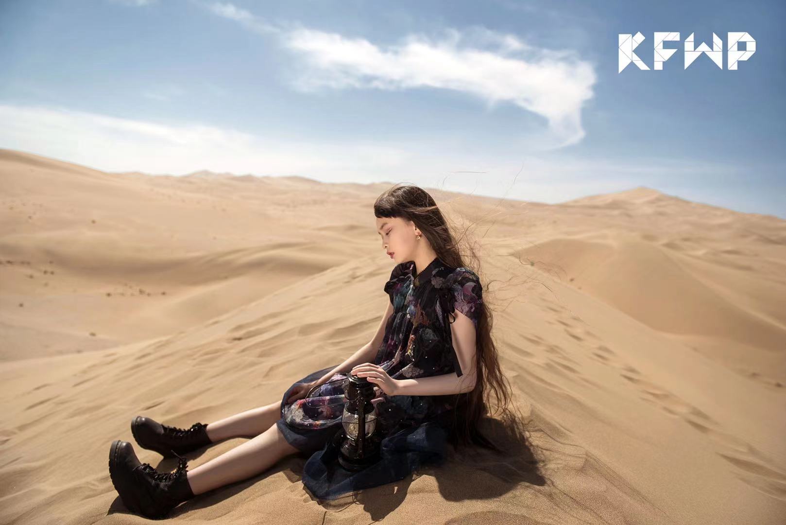 由设计师达子设计的,受梵高鸢尾花影响特别设计的印花,在戈壁中盛开,赞美自然,赞美艺术家们细致敏锐的观察、大胆的想象,在蔚蓝色天空的映衬下,大地色系的裙子,文静、优雅,如同在讲述着敦煌这片土地,丰厚灿烂的历史。