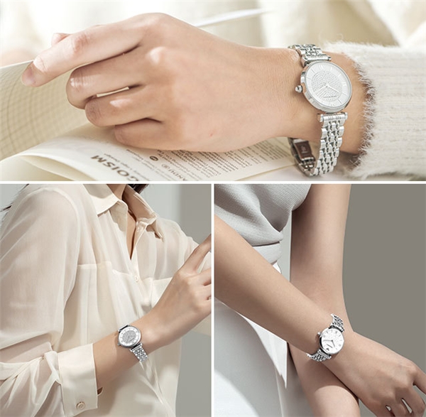 优雅的银白色带着简约干净的感觉,纯净的颜色使整个手表看起来更加光亮,整齐分布密镶的水晶晶莹剔透,充满亮梦幻之美。