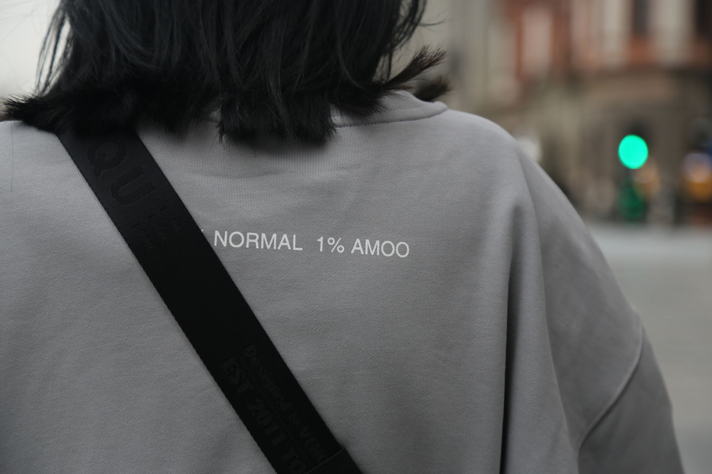 卫衣的背后则大面积留白,只在背部中央印有99%NORMAL ,1%AMOO的字样。
