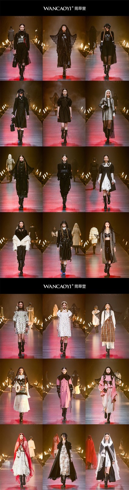 一种神秘、无所循迹的古老物种文明在这颗星球上孕育,成为初代文明——WANCAOYI菀草壹。灵性与神秘主义的、祭祀文明的、暗黑宗教的美学呈现方式,充斥在WANCAOYI菀草壹2021秋冬系列的服饰语言中,配合着沉寂辽阔感的装置艺术与空灵怪诞的音乐背景,让人仿佛置身宇宙星际之中,失重感、耳鸣感伴随着愈发紧密的钢琴音与不明生物的语言,将超现实、迷幻浪漫的品牌风格极致地展现了出来。设计师仿佛为观众造了一场梦,并享受着他们沉浸在梦中世界的剧情。复杂多元并永远保持捉摸不定的变化,才是菀草壹品牌和设计师的绝对向往。