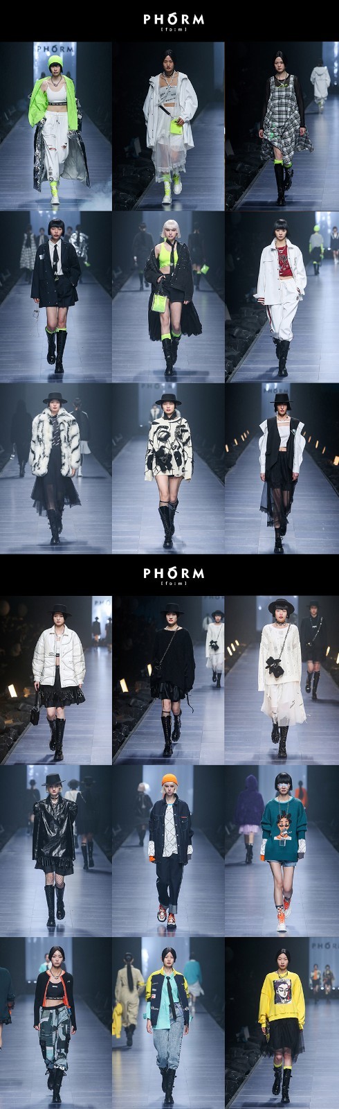 在引力的束缚下,星球上的一切都在循序运转,渐渐地陷入无边空灵与寂静之中,窒息感、慌乱感袭来。忽然,一个神秘物种逆光而来——PHÓRM,由碳基硅基结合而生的“幼神”诞生了。伴随而来一股巨大混响,哇音与激烈的吉他法兹音色,愈来愈立体的声效包围了观众。无边浩瀚的宇宙太空展现在脚下,“幼神”发出的太空耳语,不断穿梭在耳边,充满危险、不满与愤怒,却又纯粹而真实,仿佛在质问“误闯禁地”的观众,打扰了它享受自我的狂欢。正如PHÓRM品牌所代表的的一群追求个性与自我解放的年轻血液,永远不可能与主流和谐共生的价值意识和审美,是他们的最佳保护色。现场充满科技感的激光光束、交织的迷幻色彩、节奏感强烈的背景音乐,转而成为一场PHÓRM女孩的狂欢之夜,不顾及旁人目光,沉浸在自我世界之中。